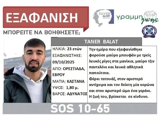 Συναγερμός έχει σημάνει στην Ορεστιάδα, για την εξαφάνιση του Taner Balat, 23 ετών, από την περιοχή του σταθμού ΚΤΕΛ στις 09/10/2025.