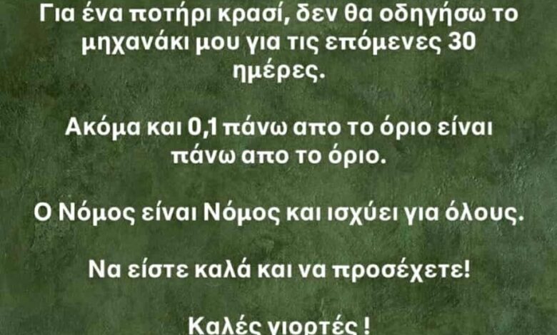 Την είδηση επιβεβαίωσε η ίδια με story στο Instagram σημειώνοντας πως «για ένα ποτήρια κρασί, δεν θα οδηγήσω το μηχανάκι μου για τις επόμενες 30 ημέρες».
