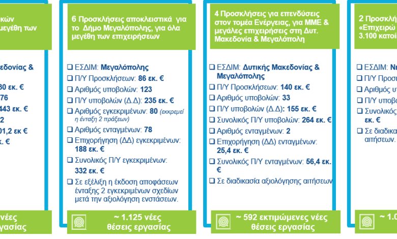 6 προσκλήσεις κρατικών ενισχύσεων για όλα τα μεγέθη επιχειρήσεων στη Δυτική Μακεδονία και τη Μεγαλόπολη, προϋπολογισμού 330 εκατ. ευρώ, κινητοποίησαν 976 υποβολές, με 852 πράξεις να προχωρούν σε ένταξη ή να βρίσκονται υπό ένταξη. Η Δημόσια Δαπάνη ανέρχεται σε 401,2 εκατ. ευρώ, με συνολικό προϋπολογισμό έργων 629 εκατ. ευρώ. Οι έξι προσκλήσεις αποκλειστικά για τον Δήμο Μεγαλόπολης (προϋπολογισμός 86 εκατ. ευρώ) κατέγραψαν 123 υποβολές και οδήγησαν σε 80 εγκρίσεις, με Δημόσια Δαπάνη 188 εκατ. ευρώ και συνολικό προϋπολογισμό εγκεκριμένων έργων 332 εκατ. ευρώ.