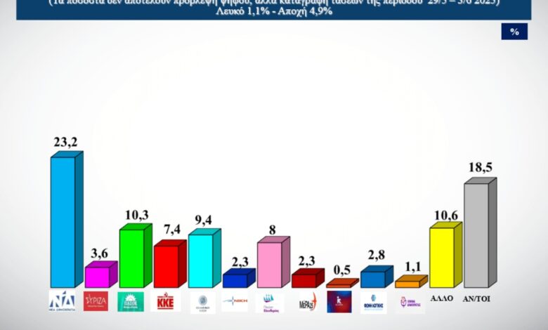 Στην πρόθεση ψήφου επί των εγκύρων, η Νέα Δημοκρατία καταγράφεται στο 23,2% και το ΠΑΣΟΚ στο 10,3%. Ακολουθούν η Ελληνική Λύση με 9,4%, η Πλεύση Ελευθερίας συγκεντρώνει 8%, το ΚΚΕ με 7,4%, ο ΣΥΡΙΖΑ στο 3,6% ενώ η Νίκη και το ΜέΡΑ25 από 2,3% η καθεμία. Η Νέα Αριστερά εμφανίζεται στο 0,5%, η Φωνή Λογικής στο 2,8% και οι Δημοκράτες στο 1,1%. Το «Άλλο» φτάνει το 10,6%, ενώ οι αναποφάσιστοι ανέρχονται στο 18,5%.