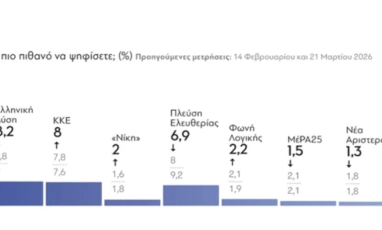 Την ίδια στιγμή, το ΠΑΣΟΚ – Κίνημα Αλλαγής εμφανίζεται ενισχυμένο, ανεβαίνοντας από το 11,4% του Μαρτίου στο 12,8%. Αντίθετα, η Πλεύση Ελευθερίας συνεχίζει την πτωτική της πορεία, καταγράφοντας ποσοστό 6,9%.