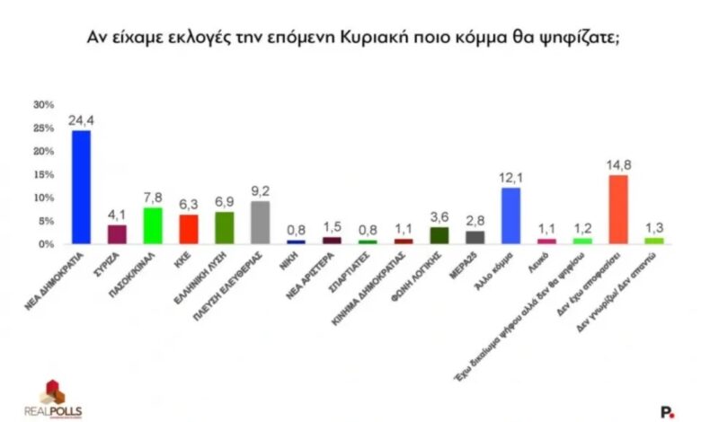 Δημοσκόπηση RealPolls: Πρωτιά για τη ΝΔ, δεύτερη η Πλεύση Ελευθερίας