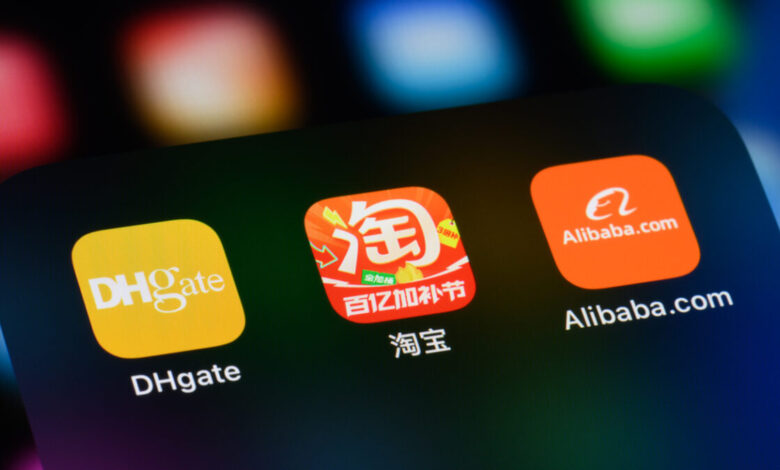 Toronto, Canada – April 18, 2025: Chinese e-commerce apps on a smartphone – DHgate, Taobao, and Alibaba.