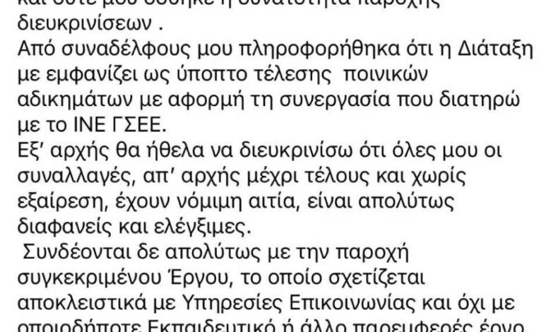 «Από συναδέλφους μου πληροφορήθηκα ότι η Διάταξη με εμφανίζει ως ύποπτο τέλεσης ποινικών αδικημάτων με αφορμή τη συνεργασία που διατηρώ με το ΙΝΕ ΓΣΕΕ. Εξ’ αρχής θα ήθελα να διευκρινίσω ότι όλες μου οι συναλλαγές, απ’ αρχής μέχρι τέλους και χωρίς εξαίρεση, έχουν νόμιμη αιτία, είναι απολύτως διαφανείς και ελέγξιμες. Συνδέονται δε απολύτως με την παροχή συγκεκριμένου Έργου, το οποίο σχετίζεται αποκλειστικά με Υπηρεσίες Επικοινωνίας και όχι με οποιοδήποτε Εκπαιδευτικό ή άλλο παρεμφερές έργο».