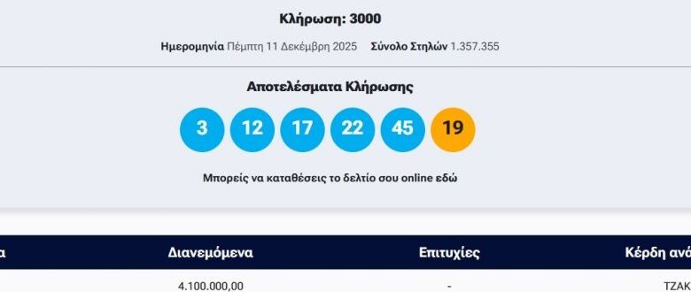 Πραγματοποιήθηκε το βράδυ της Πέμπτης (11/12) η κλήρωση 3000 του Τζόκερ που μοιράζει στην πρώτη κατηγορία πάνω από 4.100.000 ευρώ.