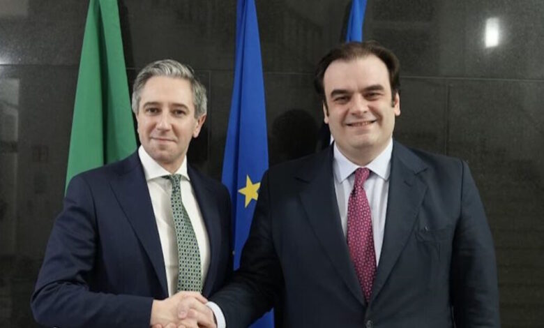 Με τον Αντιπρόεδρο της Ιρλανδικής Κυβέρνησης και Υπουργό Οικονομικών Σάιμον Χάρις συναντήθηκε σήμερα (1.12.2025) στο Δουβλίνο, ο Υπουργός Εθνικής Οικονομίας και Οικονομικών Κυριάκο Πιερρακάκη. Κατά τη διάρκεια των συνομιλιών επιβεβαιώθηκε το άριστο επίπεδο των διμερών σχέσεων Ελλάδας–Ιρλανδίας και η κοινή δέσμευση για στενή συνεργασία σε κρίσιμες ευρωπαϊκές προτεραιότητες.
