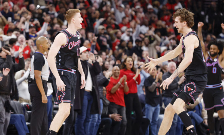 Ο Κέβιν Χέρτερ πανηγυρίζει το τρίποντο νίκης των Μπουλς/ Mandatory Credit: Kamil Krzaczynski-Imagn Images