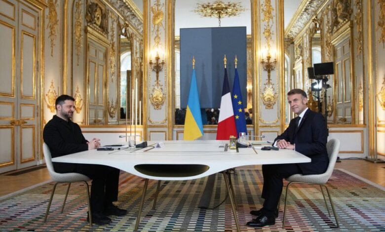 Ο Γάλλος πρόεδρος Εμανουέλ Μακρόν (δεξιά) και ο Ουκρανός πρόεδρος Βολοντίμιρ Ζελένσκι σε συνάντηση, τη Δευτέρα 1 Δεκεμβρίου 2025, στο Μέγαρο των Ηλυσίων στο Παρίσι.
