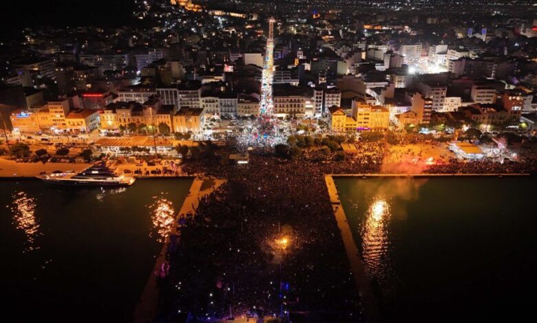 Παράλληλα, ο ουρανός της Πάτρας φωτίστηκε από χιλιάδες πυροτεχνήματα σε μια μοναδική στιγμή με ρυθμό, ένταση, και υπό τους ήχους δυνατής μουσικής.