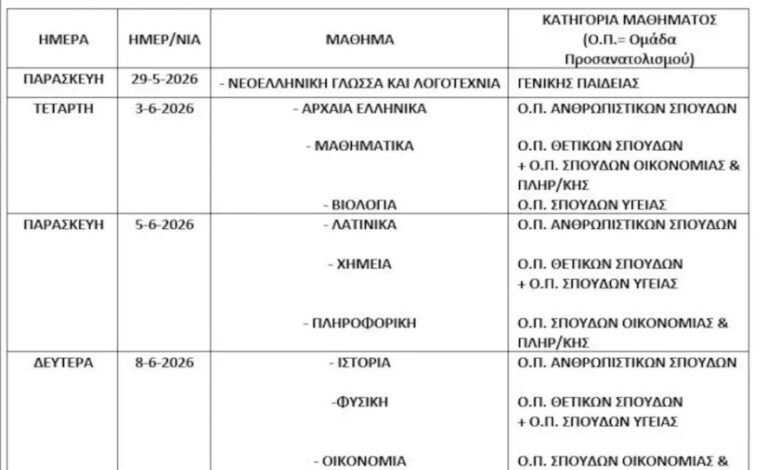 Την Παρασκευή 5 Ιουνίου οι μαθητές των ημερήσιων και εσπερινών Γενικών Λυκείων θα εξεταστούν σε Λατινικά, Χημεία και Πληροφορική, ενώ τη Δευτέρα 8 Ιουνίου σε Ιστορία, Φυσική και Οικονομικά.
