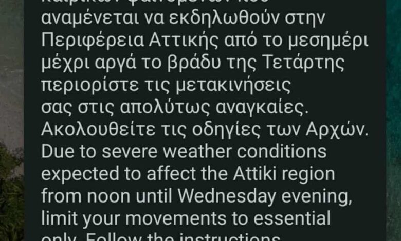 «Λόγω έντονων καιρικών φαινομένων που αναμένεται να εκδηλωθούν στην περιφέρεια Αττικής από το μεσημέρι μέχρι αργά το βράδυ της Τετάρτης, περιορίστε τις μετακινήσεις σας στις απολύτων αναγκαίες» αναφέρει χαρακτηριστικά το μήνυμα.