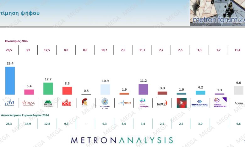 Σύμφωνα με την εκτίμηση ψήφου που παρουσιάζει η δημοσκόπηση της Metron Analysis η Νέα Δημοκρατία βρίσκεται στο 29,4%, το ΠΑΣΟΚ ελαφρά ενισχυμένο στο 12,7%, όπως και η Ελληνική Λύση στο 10,7% και το ΚΚΕ στο 8.3%, ενώ σε ελαφρά υποχώρηση η Πλεύση Ελευθερίας στο 11,2%.