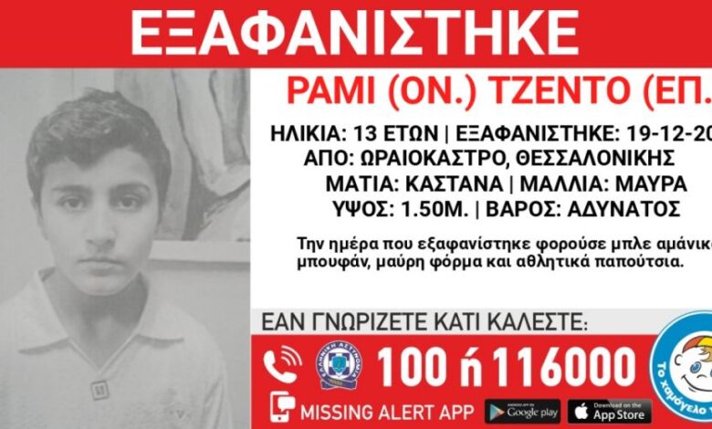 Συναγερμός για την εξαφάνιση 13χρονου από τη Θεσσαλονίκη