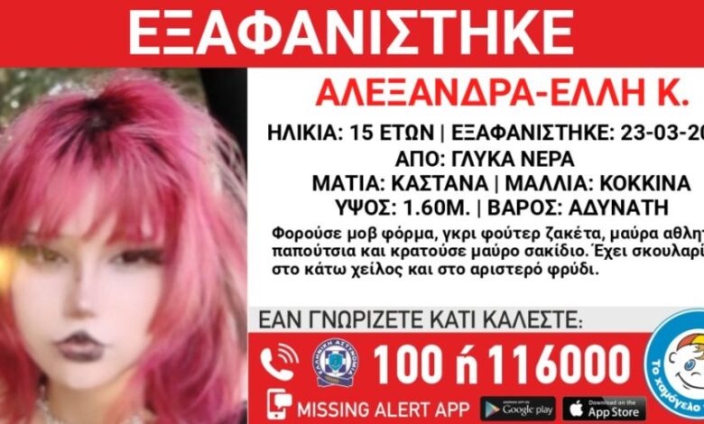 «Στις 23/3/2026, απογευματινές ώρες, εξαφανίστηκε από την περιοχή των Γλυκών Νερών Αττικής, η Αλεξάνδρα-Έλλη Κ., 15 ετών. Το «Χαμόγελο του Παιδιού» ενημερώθηκε σήμερα 24/3/2026 και προχώρησε στη δημοσιοποίηση των στοιχείων της ανήλικης, κατόπιν αιτήματος της οικογένειας της, καθώς ενδέχεται να συντρέχουν λόγοι που θέτουν τη ζωή της σε κίνδυνο.