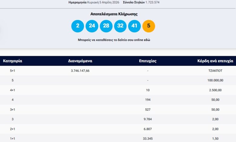 Οι τυχεροί αριθμοί που ανέδειξε η αποψινή κλήρωση είναι: 2, 24, 28, 32, 41 και Τζόκερ το 5.
