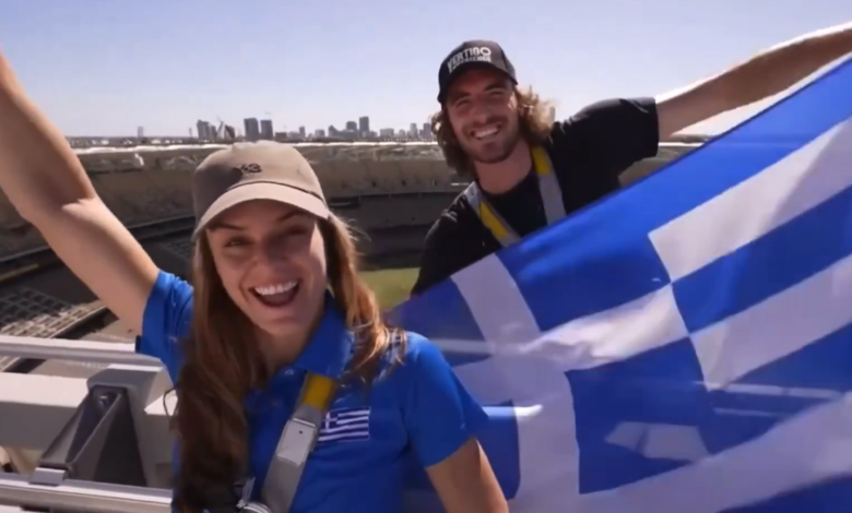 Τσιτσιπάς και Σάκκαρη ανέβηκαν στην οροφή του γηπέδου στο Περθ και ανέμισαν την ελληνική σημαία
