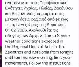 Προειδοποιητικό μήνυμα εστάλη από την Πολιτική Προστασία στους κατοίκους Αχαΐας, Ηλείας, Ζακύνθου και Κεφαλονιάς ενόψει των έντονων καιρικών φαινομένων. «Λόγω των…