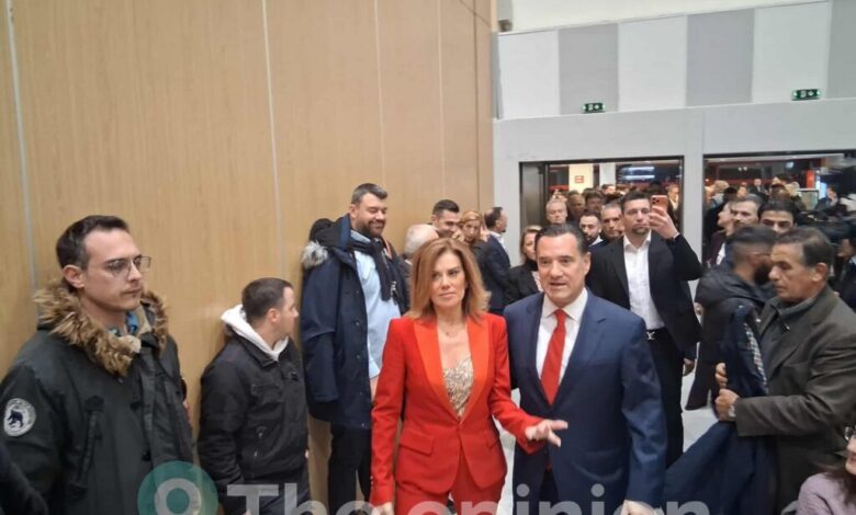 Ο υπουργός Υγείας, Άδωνις Γεωργιάδης έφτασε χαμογελαστός και ευδιάθετος στον χώρο της εκδήλωσης, όπου τον υποδέχτηκε με ένα φιλί η σύζυγός του Ευγενία Μανωλίδου.